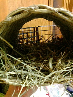 エサいれはサトが小さすぎてトイレにしちゃったし、走り回って角に頭をぶつけそうにしているので撤去。